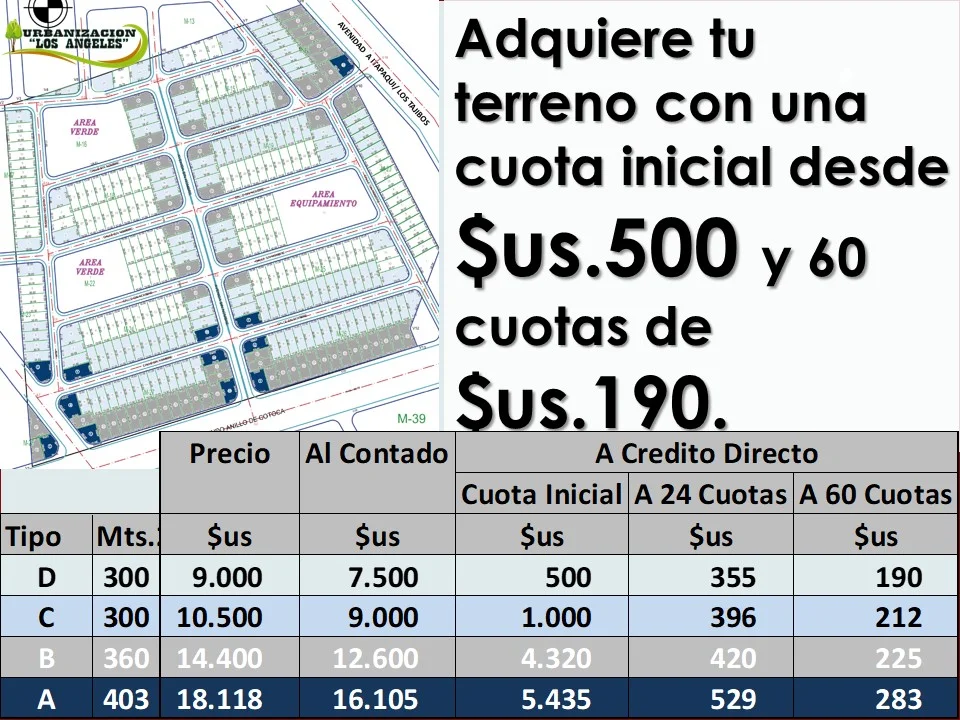 En este momento puedes aprovechar los precios de promoción con lotes ➡ a creditos y al contado ➡con couta inicial del 30%, 1.000 $us o 500 $us. Con plazos a 24 y 60 meses. con cuotas mensuales de 190 $us a 283 $us.