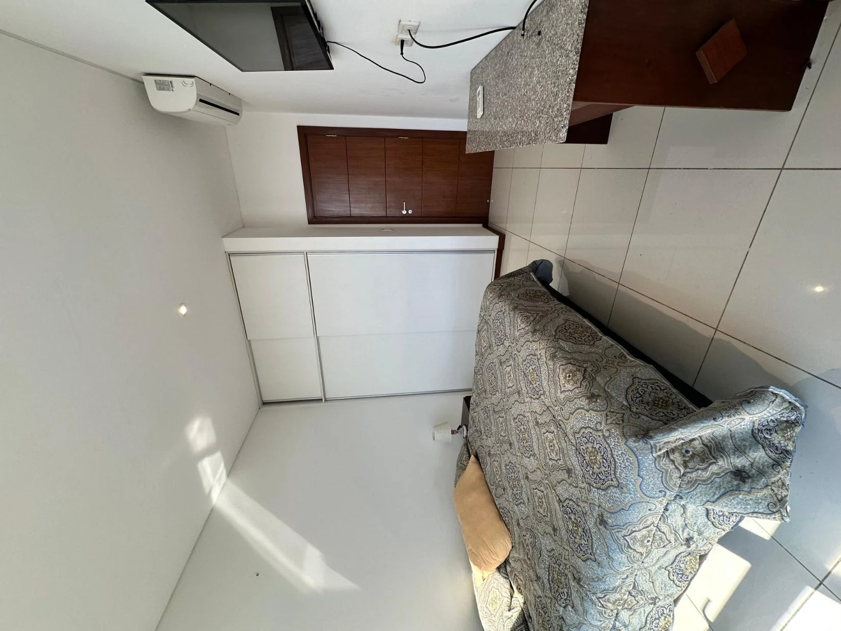 - 1 dormitorio equipado con cama de 2 plazas y media, cortinas, aire acondicionado, ropero empotrado, TV pequeña.
