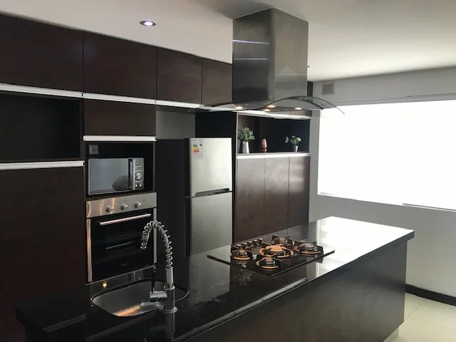 - Living cocina comedor integrada, equipada con aire acondicionado, muebles de living, muebles de cocina superiores e inferiores, cocina encimera Cata de 5 hornallas, heladera Daewoo, horno eléctrico Cata, microondas Daewoo, lavadora secadora Samsung, intercomunicador. Cuenta con gas domiciliario.