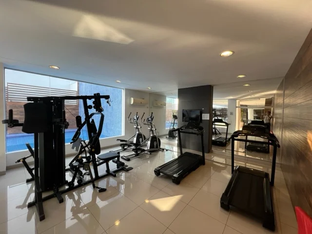 ===================================================================== - Condominio elegante, con lobby de ingreso y guardia de seguridad 24 Hs. Cuenta con cámaras de seguridad, 1 ascensor Orona, 5 pisos, área social en el quinto piso que cuenta con salón de gimnasio equipado con TV y aire acondicionado, piscina al aire libre con hermosa vista de Manzana 40, 3 churrasqueras, 3 salas de TV, rampa de ingreso, parqueo techado en subsuelo.