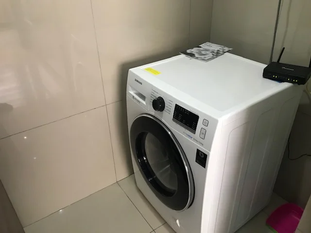 - Area de lavandería con lavadora secadora Samsung.