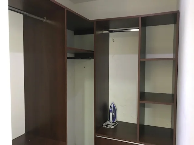 - 1 dormitorio en suite con vestidor (baño privado completo) con acceso a balcón, equipado con aire acondicionado, TV Daewoo, cama de 2 1/2 plazas, cortinas.
