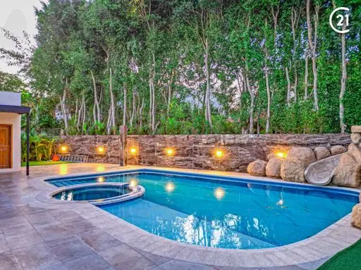 • Patio Trasero: Churrasquera y piscina privada con cascada de piedras.