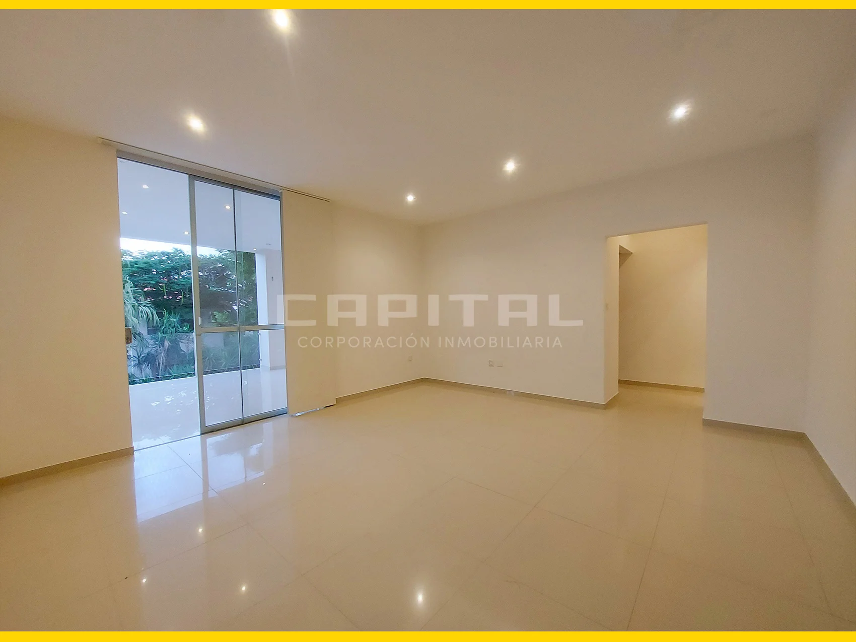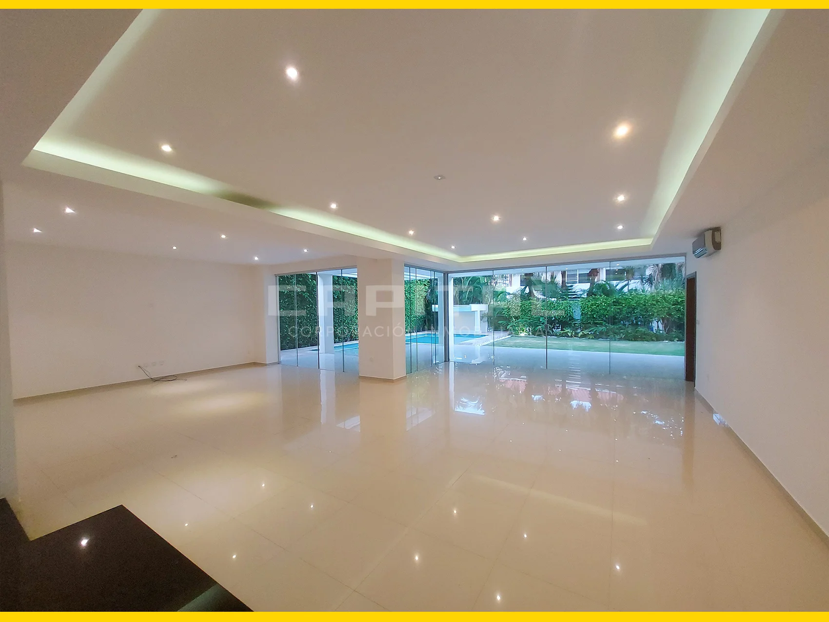 Living – comedor amplio con blindex hacia el jardín y galerías