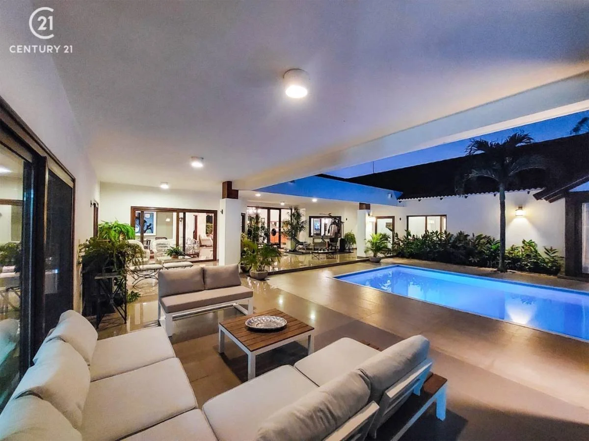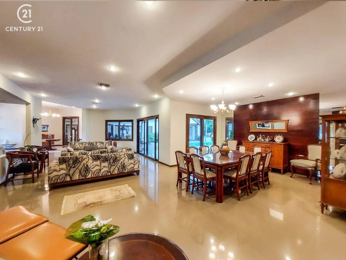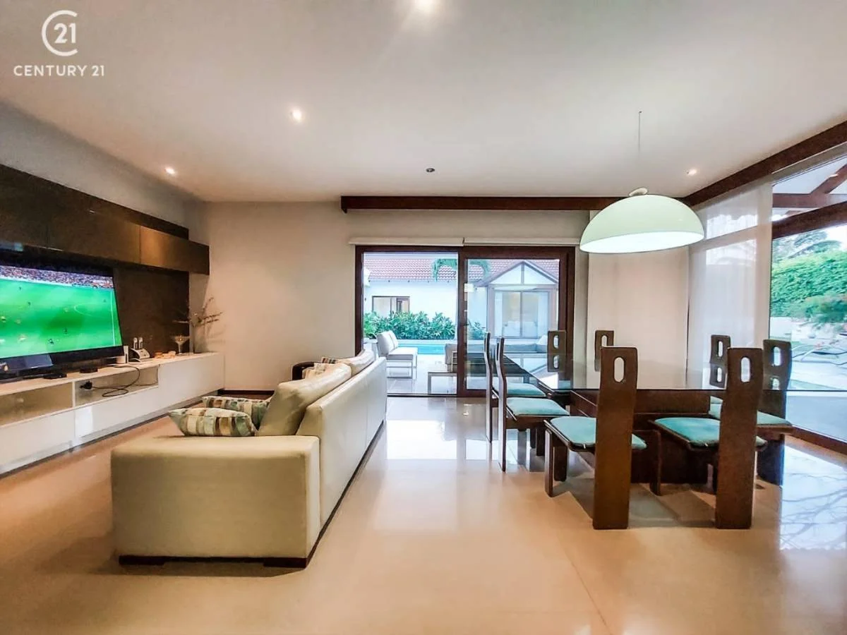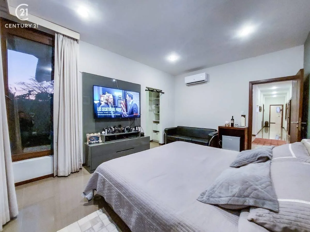 Consta de: 3 dormitorios en suite con vestidor, 1 master suite con vista a la piscina y jardín, 1 sala de estar, living- comedor, escritorio ejecutivo, cocina con comedor de diario con sala de tv, baño de visitas, dependencia de servicio, 2 depósitos, piscina, churrasquera, sauna, jardín, garaje para 4 vehículos.