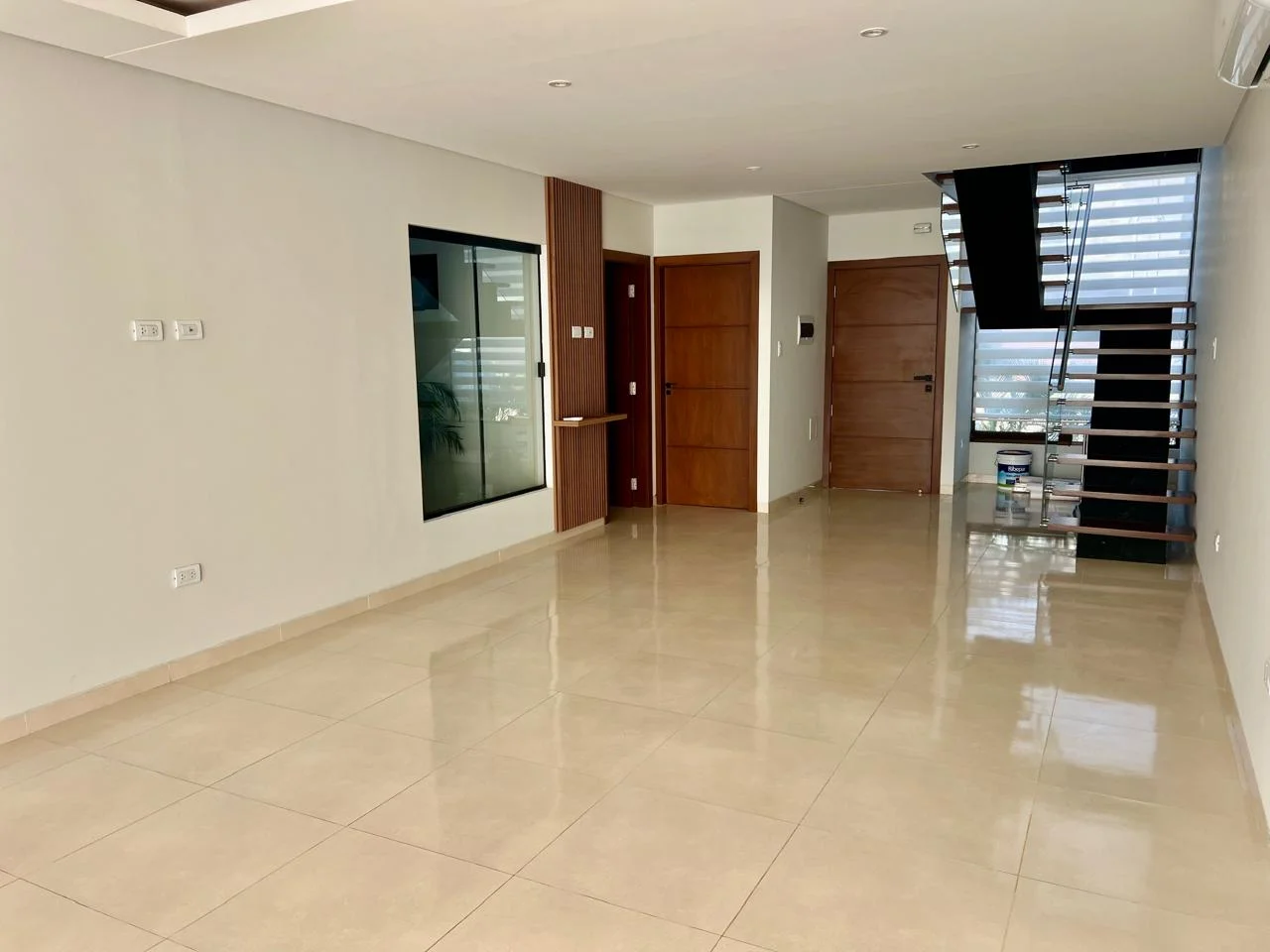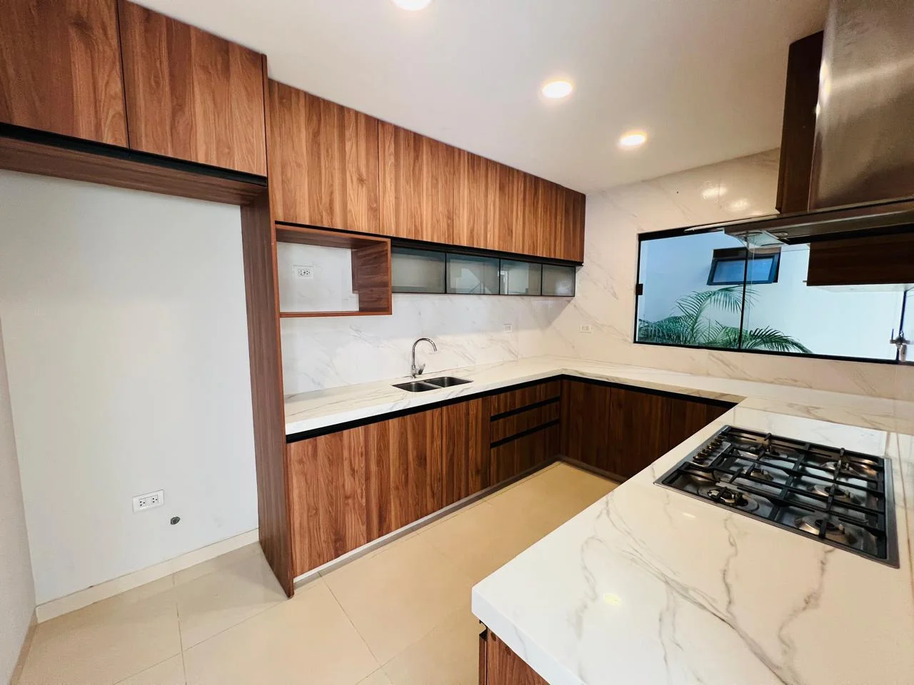 Planta Baja: living comedor, cocina equipada, baño de visita, escritorio/dormitorio, amplio jardín, parqueo 2 vehículos, despensa y lavandería.