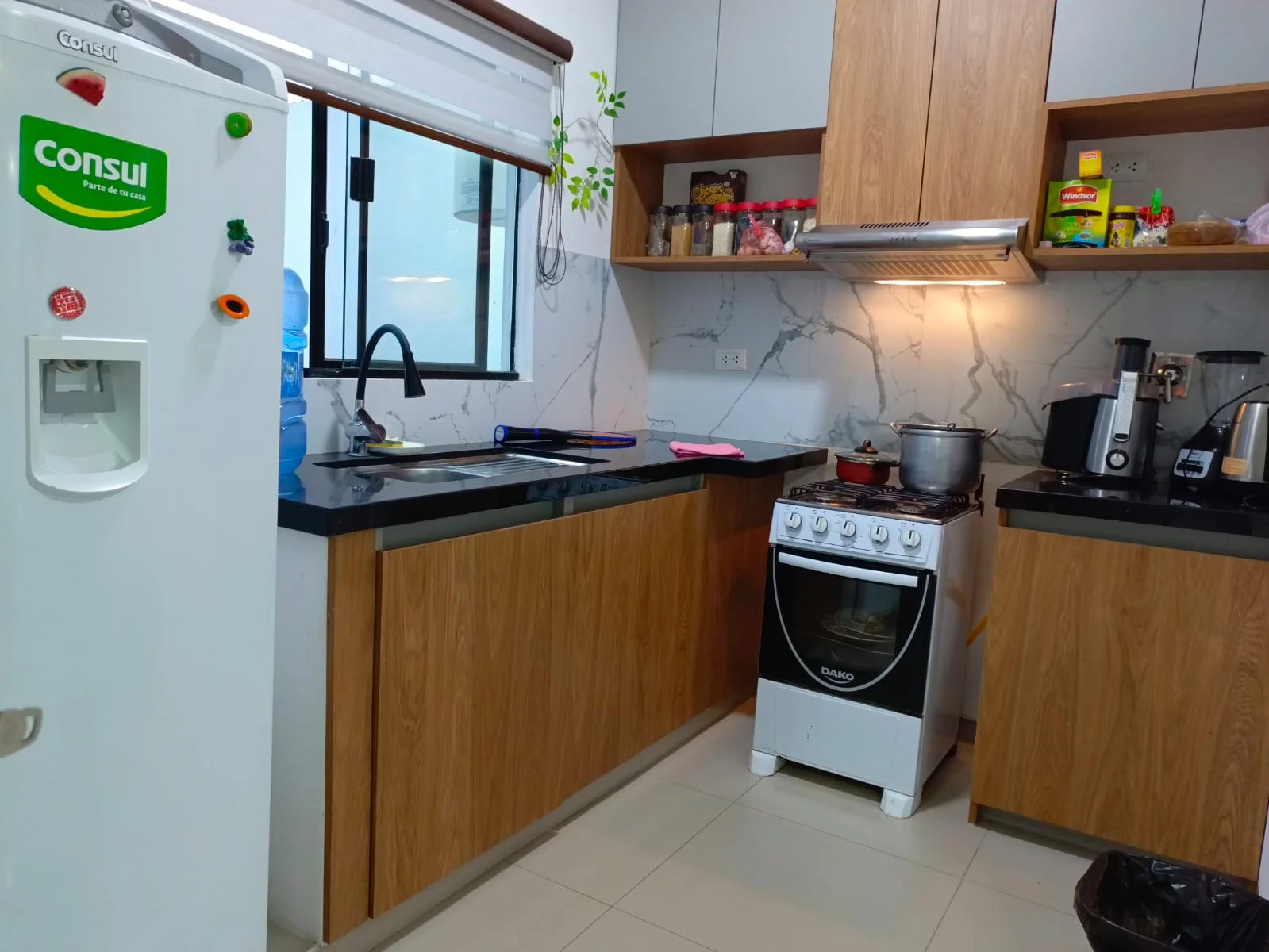 cocina equipada con cajonería: heladera licuadora, extractora, jarra eléctrica, utensilios