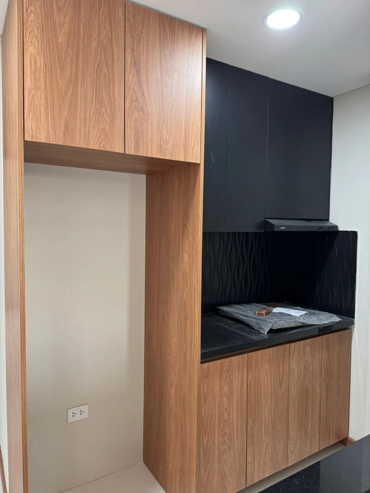 cocina estilo americana equipada con cajonería alta y baja, cocina encimera y extractor