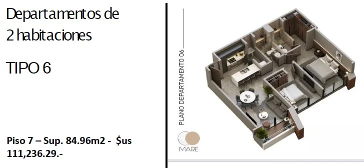 Descubre este exclusivo apartamento en venta en la prestigiosa zona de Equipetrol, Santa Cruz. Con una superficie de 85m2, esta moderna propiedad cuenta con 2 dormitorios y 2 baños, perfecta para una pareja o pequeña familia en busca de comodidad y estilo. Ubicado en un edificio a estrenar, ofrece la oportunidad de disfrutar de espacios luminosos y bien distribuidos, ideales para el día a día.