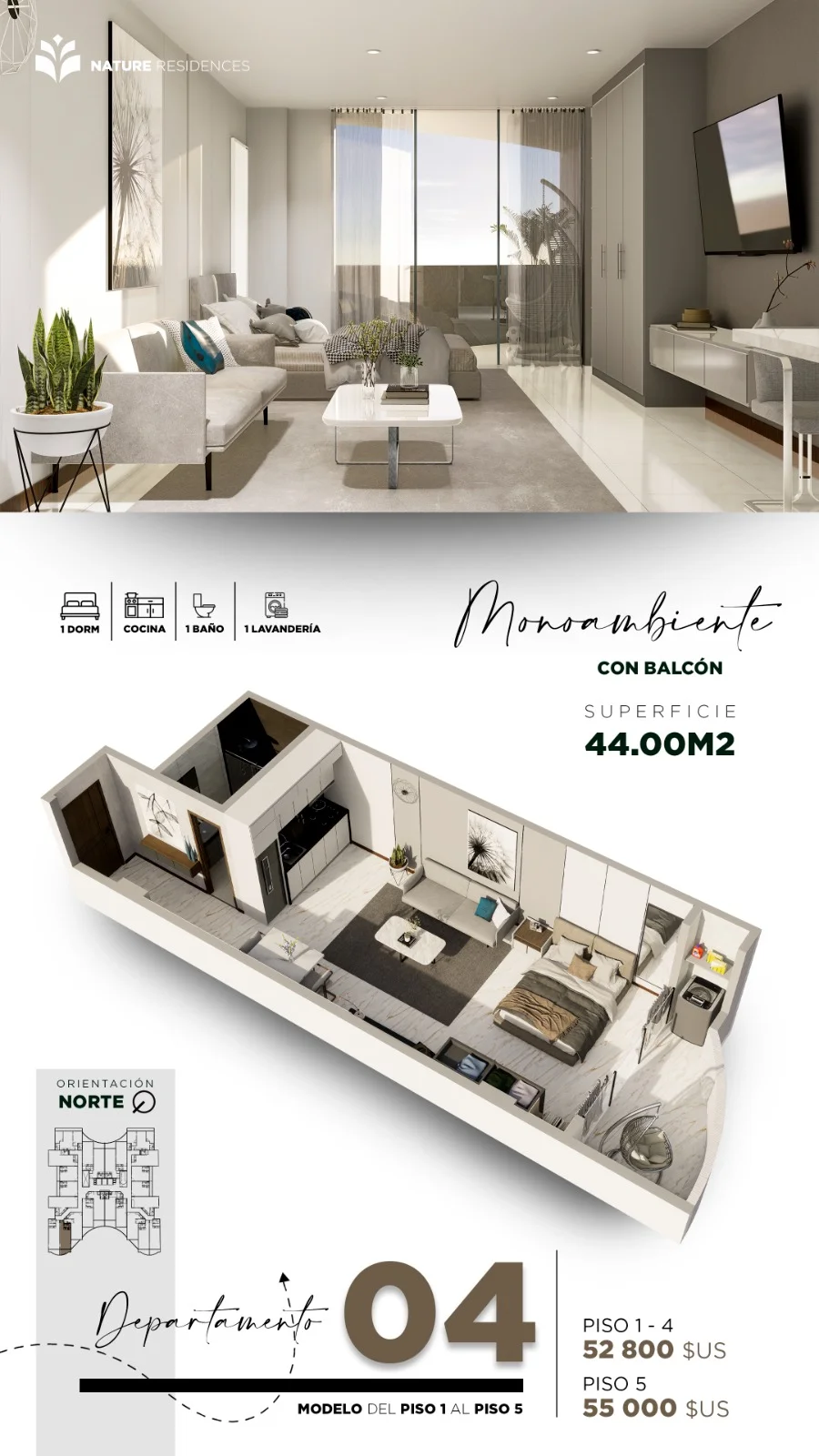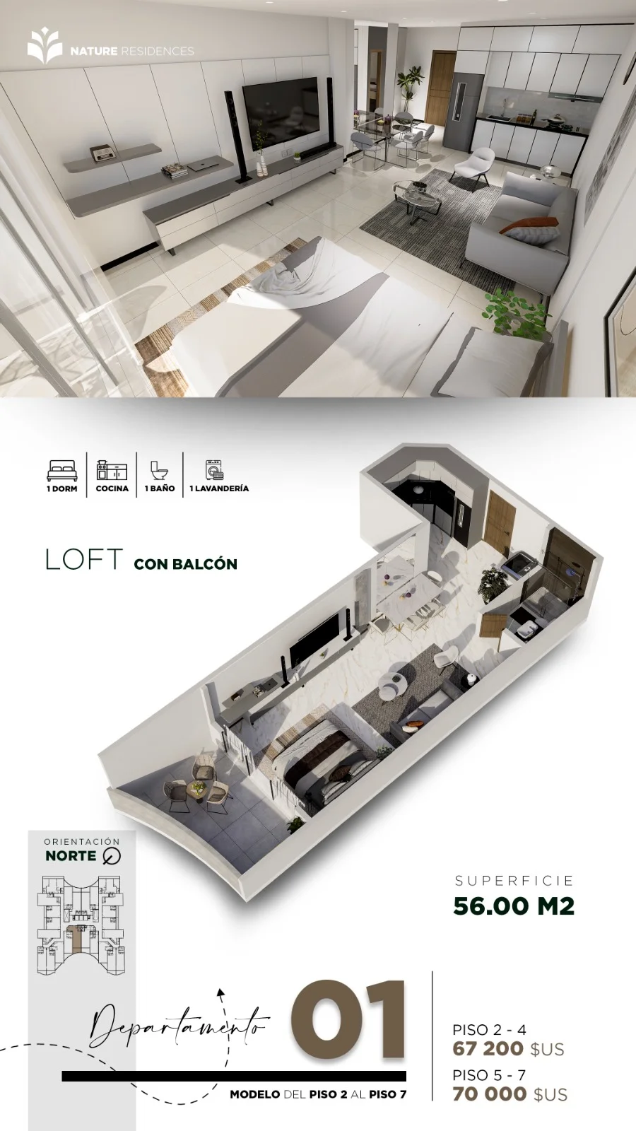 Descubre Nature Residences, un exclusivo condominio inspirado en la belleza natural. Ubicado en una privilegiada avenida, este proyecto ofrece monoambientes, lofts y departamentos de 2 dormitorios, combinando diseño moderno con un entorno verde y relajante. ????????