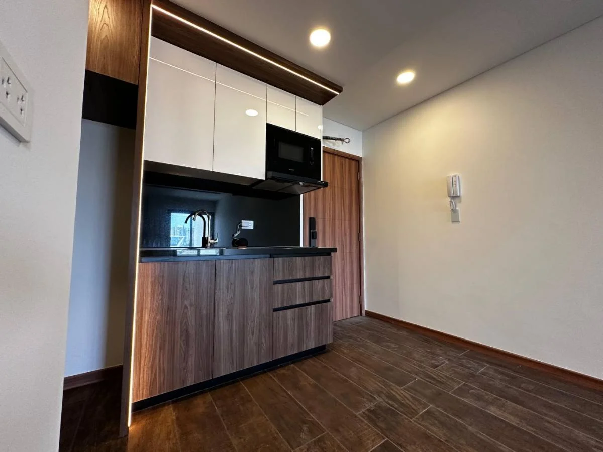 Elegante ambiente con cocina equipada (horno, encimera, extractor)