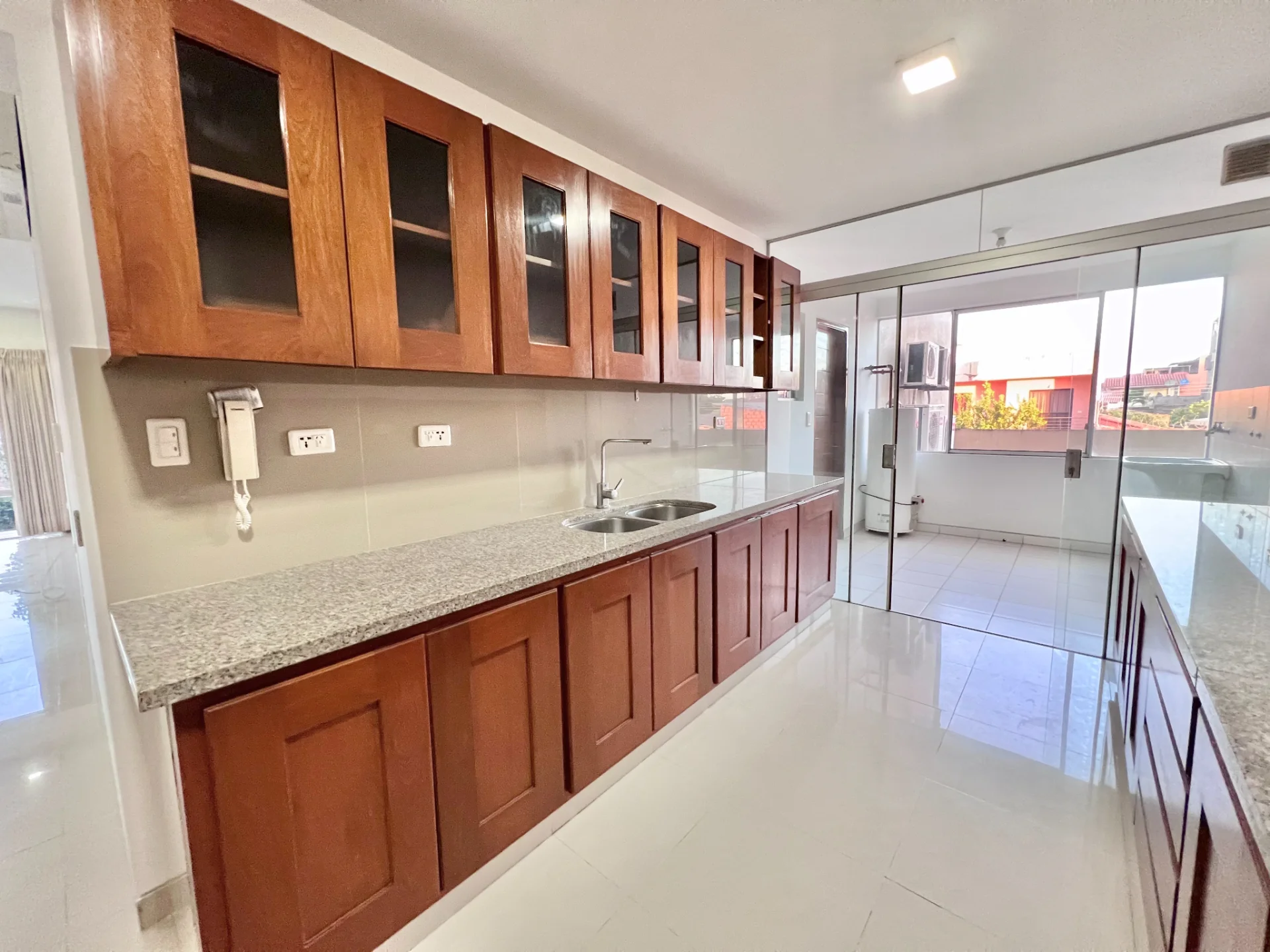 - amplia cocina equipada con muebles de madera altos y bajos