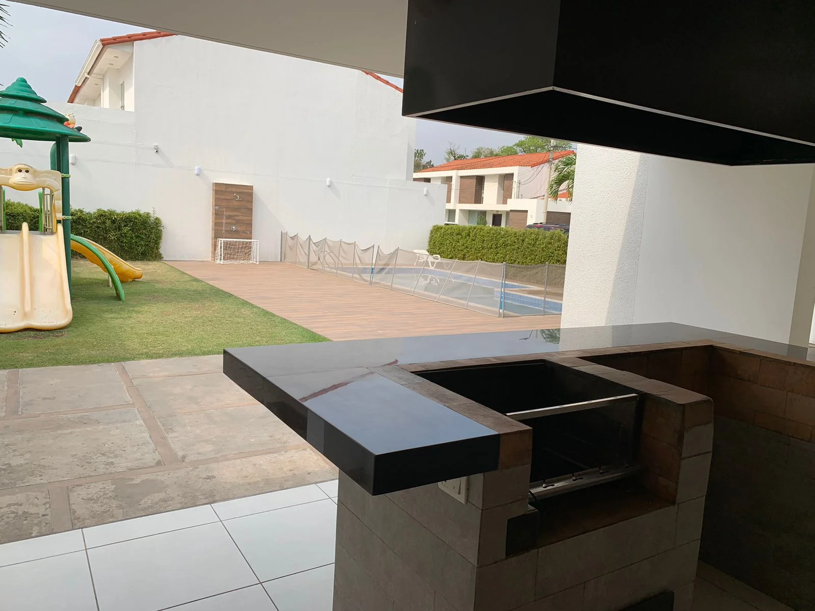 ^ Area social con Churrasquera con giragrill y caja china