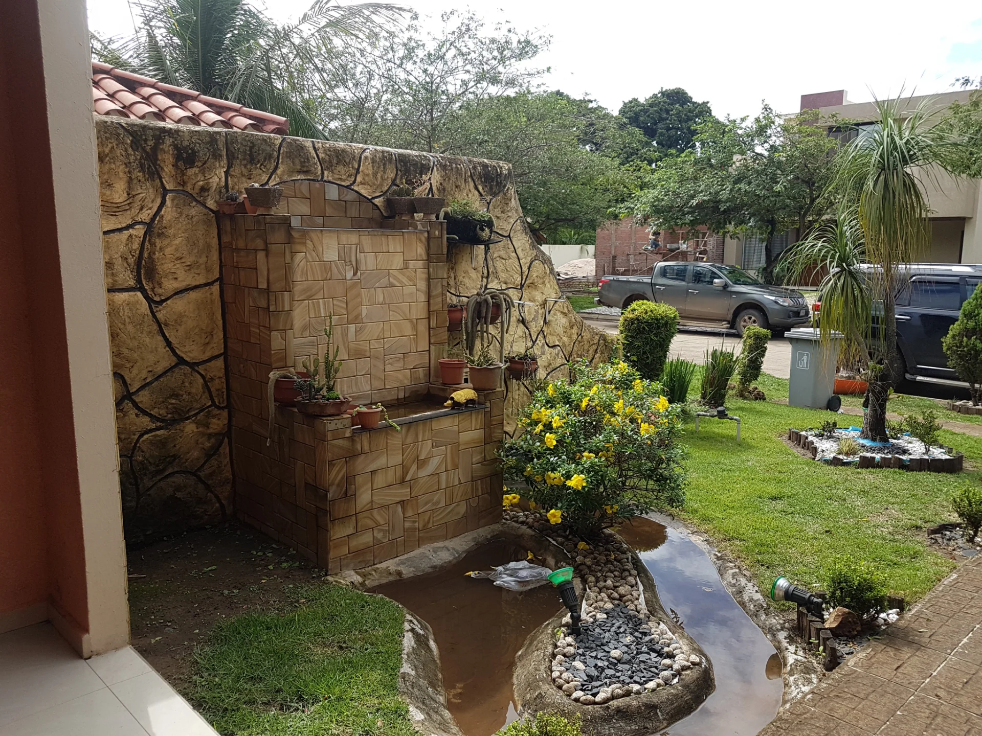 Bonito paisajismo en patio delantero con cascada de agua