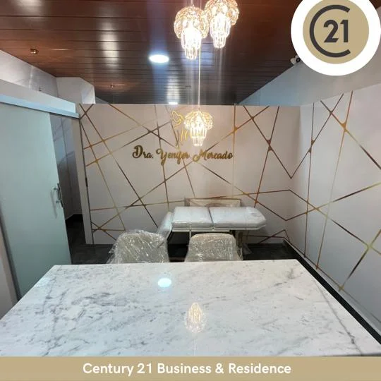 Elegante mueble de Recepción con Tv, 2 Consultorios o estudios con sillones, mesa, sillas y muebles de guardado. También consta de camillas para la atención pacientes, instalación de cámaras de seguridad, baño, empapelado en toda la pared, techo decorado con revestimiento con detalles de madera, iluminación con led, lámparas y cuadros decorativos.